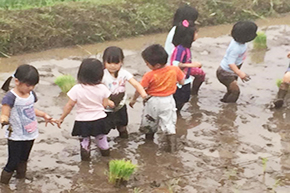 6月4日(日)には地区に伝わる田植歌を元に、サクソフォーンとコンテンポラリーダンスによる田植え祭りを行いました。保育園の子どもたちもやってきて、田植えのお手伝いを一生懸命頑張りました。