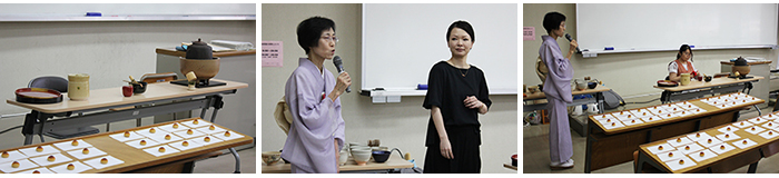 茶道サークル部長の興梠留実さん(専攻科造形専攻)が、近年流行しているという立礼式(テーブルと椅子でお茶を楽しむスタイル)のお手前を皆さんの前で実演しながら、久々宮先生に解説していただきました。