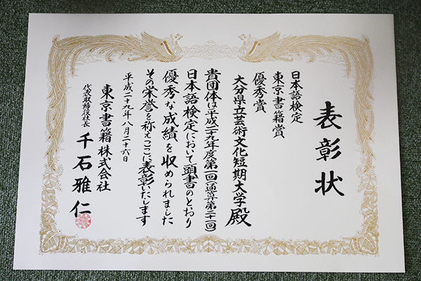 平成29年度第1回日本語検定において、本学国際総合学科の学生が東京書籍賞優秀賞(団体表彰)を受賞しました。