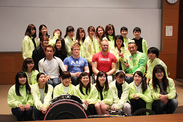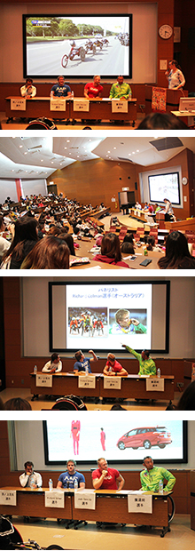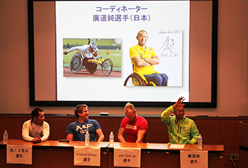 コーディネーターに車いすマラソンプロアスリートの廣道純選手、パネリストに洞ノ上浩太選手、カナダからジョッシュ・カシディ選手、オーストラリアからリチャード・コルマン選手をゲストにお迎えし、ジュリー・ヌートバー准教授の通訳により、様々なお話しを伺いました。