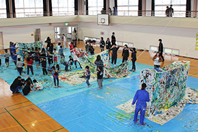 アート講座後半は学生たちが段ボールで作った魚やペットボトルに絵の具を塗り、リボンやスパンコールでデコレーションしました。最後は布と段ボールの魚をロープに吊るし、絵の具の海の完成です!中をくぐってみたり、ジャンプして触ってみたりと皆さん完成後も楽しんでいる様子でした。