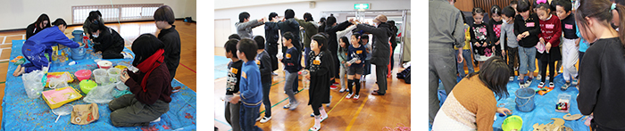 今回のテーマは「絵の具の海を魚と遊ぼう!」。本学美術科美術専攻1年生27名と、臼杵市立市浜小学校2年生のみなさんで3つのグループに分かれ、絵の具の海づくりを行いました。