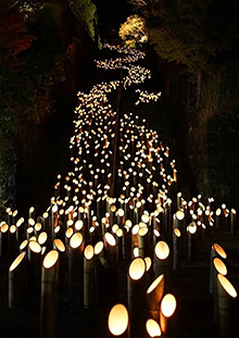 手入れが行われずにはびこる竹林を手入れして整備するとともに旧岡城城下町のにぎわいを取りもどそうと始まり、今年で第18回目となりました。広瀬神社やキリシタン洞窟礼拝堂の竹灯籠の設置をお手伝いし、点火式に参加しました。