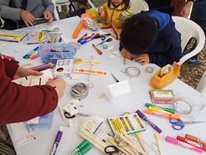 ワークショップとして藍染体験と、割りばしグライダー作りを行いました。去年は1日の参加でしたが、今年は開催日3日間のうち2日間参加致しました。割りばしグライダー作りは、子ども達に大人気でした。素材は簡単なものではありますが、皆それぞれにデコレーションを加えカラフルな楽しいグライダーがたくさん仕上がりました。出来上がったグライダーを飛ばして遊ぶ広場もありますので自然豊かな久住で子ども達は楽しく遊んでおりました。
