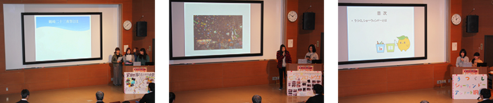 今回はサービスラーニング開始時から指導を担当し来年3月に退職される情報コミュニケーション学科吉良伸一教授の退職も記念しての開催となり、この日は卒業生の方々、企業・団体の方々にも聴講に訪れていただきました。中山学長は「芸文短大で皆さんの活動を見てきて元気をもらいました。実社会で自分の学習の成果を試すという活動を支えてこられた吉良先生に敬意を表します。」とあいさつし、満員の会場でにぎやかにフォーラムは開始しました。