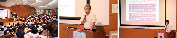 大講義室をメイン会場に、3ケ所の講義室をサテライト会場にして、在学生の司会進行のもと、全体説明会を行いました。中山欽吾学長より「過去最高の参加者数にありがたく思うと同時に身が引き締まる思いです。本学に入学して後悔することは絶対させません。ぜひ一緒に勉強しましょう。」と歓迎の挨拶を贈りました。