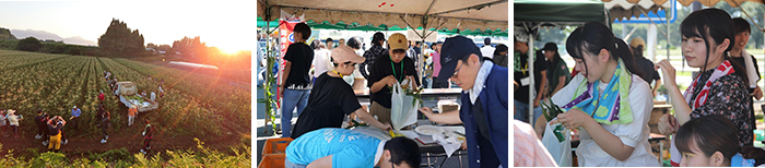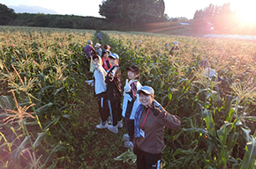 2日目は午前5時からとうきび(とうもろこし)畑で収穫体験を行いました。夜明け前に収穫することで一番糖度が高くなり、その糖度はメロンを上回るそうです。収穫の後は、とうきび農園で竹田市におけるとうきび栽培の歴史や定着までの苦労などについて学んだ後、午前8時から午後2時まで竹田市管生の「道の駅すごう」で開催された「とうきびフェスタ」の運営・販売のサポートを行い、イベントを盛り上げました。