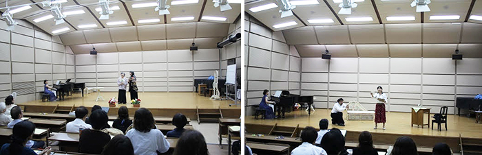 上演の合間には指導教員の愛甲教授、行天准教授によるオペラの場面の解説が入り、笑いあり涙ありのオペラの面白さを楽しく味わえる発表会となりました。