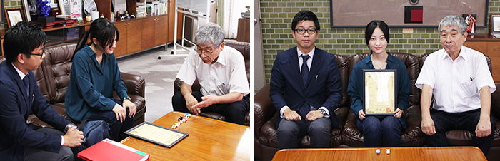 10月10日(水)、「平成29年度デザインパテントコンテスト」で入選し、今年2月に意匠登録出願を行った木下楓さん(情報コミュニケーション学科2年)と、指導にあたった野田佳邦専任講師が中山欽吾学長へ意匠権の登録証が届いたことを報告をしました。