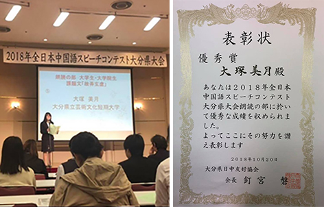 10月20日(土)に開催された「2018年全日本中国語スピーチコンテスト大分県大会【朗読の部】大学生・大学院生(大分県日中友好協会主催)」において、本学国際総合学科2年生の大塚美月さんが優秀賞を受賞しました。