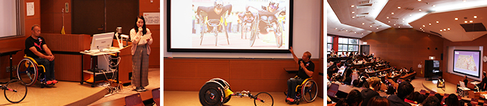 講演後、学生は競技用の車いすを体験させていただきました。大会当日に通訳ボランティアとして参加する学生は「選手の皆さんがベストを尽くせるようサポートします」と決意を述べ、廣道選手も大会への意気込みを語りました。