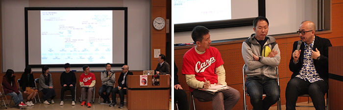 本学学生に加え一般参加の方も多数お集まりいただき、第1部ではお二人の自己紹介と、これまで制作した作品の紹介や制作の経緯などを写真や動画で紹介して頂きました。第2部では、大分合同新聞社の記者や美術科の学生らとのパネルディスカッションを行い、デザイン業界の年表を用いながら、現代美術二等兵の活動を分析していきました。