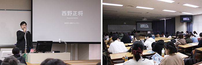 12⽉7⽇(⾦)、芸短フェスタ2018の⼀環として、本学において美術家・映像ディレクターの⻄野正将⽒(本学美術科デザイン専攻卒業⽣)をお招きし、本学学⽣と⼀般参加の⽅を対象とした上映会&トークを開催しました。
