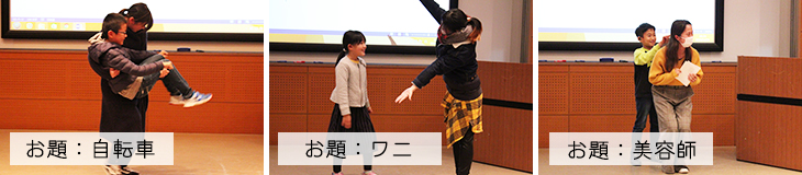 授業では児童と学生が混じったグループを作り、配られたカードに書かれたキーワードをジェスチャーで表現するワークショップを実施しました。10分間という短い相談時間で、学生は児童とコミュニケーションを取りながら、キーワードをどう演じるか、役割はどうするか等を一生懸命考えていました。