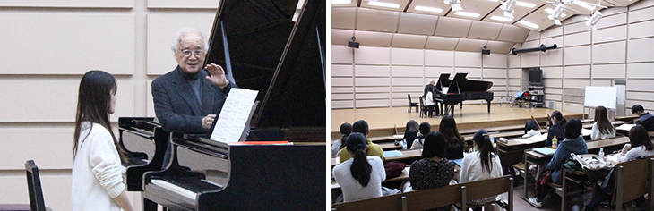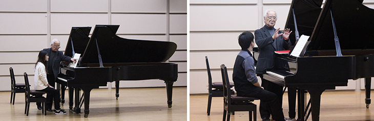 25日、26日には小林道夫先生をお迎えし、ピアノコース2年と専攻科音楽専攻2年生の学生達の公開レッスンを行いました。レッスンを受けた学生や聴講の学生は、作曲者の特徴を表現するための細かなテクニックや身体の使い方など貴重な指導内容を熱心にメモを取っていました。