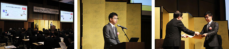 また、本学が知的財産支援室という新体制でコンテストに取り組んだことが評価され、本学も「文部科学省科学技術・学術政策局長賞」を受賞しました。この賞は、学内の知的財産マインドの向上及び知的財産制度への理解を深める積極的な取組みを行った教育機関に送られる主催者賞で、本学は平成27年度に続き二度目の受賞となりました。この受賞を受けて、表彰式では、野田講師が本学の知的財産教育についてプレゼンを行いました。