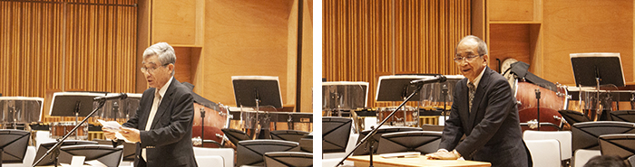 中山学長は「音楽ホール棟の完成を契機として、本学と芸術緑丘高校との高大連携を一層強化するとともに、地域の皆様に愛され、大分の地方創生を担い、支える人材を輩出する大学となれるよう、努めてまいります。」とあいさつし、広瀬知事が「この音楽ホール棟は、本学の芸術文化の香りの高さを象徴する、整備事業の中でも最も重要な施設です。これからの芸術文化短期大学の象徴として、地域の皆様に愛されることを期待しています。」と完成を祝いました。