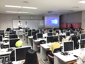 交流会では、培材大学の学生が、大学と近郊の大田(テジョン)の街並み紹介や、培材大学の魅力、外国人留学生と韓国の学生がお互いの国を理解しあうための支援プログラムなどをプレゼンテーションし、学生は興味深く聞き入っていました。