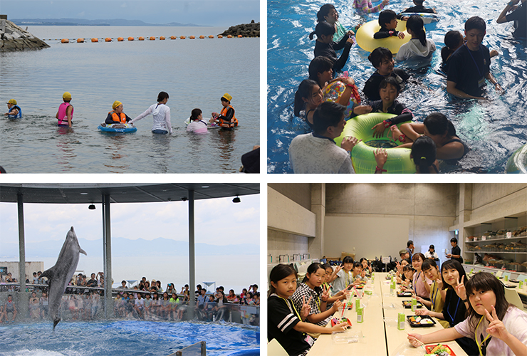 22日(月)には、別府市にあるアクアビートにおいて水遊びを、また、田ノ浦ビーチで子どもたちと一緒に海水浴を楽しみました。23日(火)は、大分市にある「うみたまご」を見学し、魚の観察やイルカのパフォーマンスなどを一緒に楽しみました。
