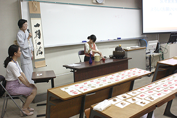 7月30日(火)、国際総合学科専門科目の「日本の伝統文化」(長福香菜専任講師)に本学茶道サークルの指導を務める久々宮宗泰裏千家師範を招き、茶道の学習を行いました。