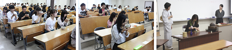 久々宮先生は 「茶道は茶室の建築、掛け軸の書、茶碗の陶芸などが含まれた総合芸術です。全てのことに関して勉強することがたくさんあります。だから楽しいんです。茶道に限らず『道』がつく伝統文化を身につければ歳をとっても楽しめます。」と学生たちに話されました。