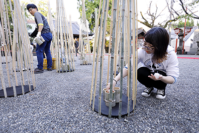 「うすき⽵宵」は毎年11⽉第1週⽬の⼟⽇に開催されているイベントで、城下町⾅杵の古い街並みが数万本の⽵ぼんぼりのあたたかい灯で包み込まれます。学内の⼯房で作品のパーツを作成し、⾅杵市の⼋坂神社で組み⽴て、点灯しました。