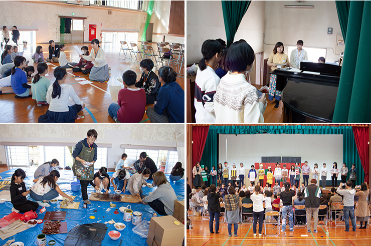 舞台は学生自ら脚本・作詞・美術演出等を企画し、児童らと演者、音響、美術に分かれ指導しました。2日間と短い期間でしたが、児童らは学生と一緒に楽しみながら舞台を作り上げ、笑いの絶えない空間の中で見事な演技と舞台演出を披露し、会場も盛り上がりました。