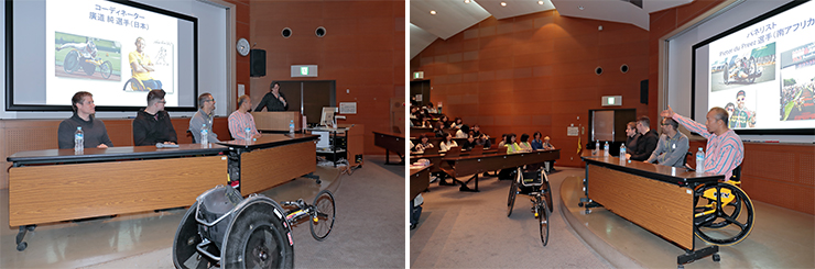 当日はコーディネーターの廣道純選手(大分県)やゲストの海外選手3名(南アフリカ1名、オーストラリア2名)をお招きして、車いす競技や大分の大会について語っていただきました。