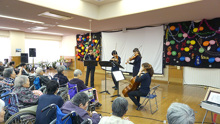 12月15日、大分県安心院町の特別養護老人ホーム「妻垣荘」において、音楽科 川瀬教授と管弦打コース学生による弦楽四重奏を披露しました。