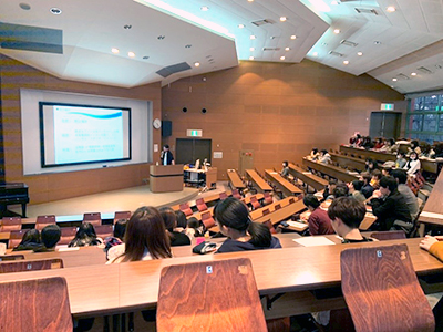 12月20日(金)、「情報リテラシーⅡ」の授業で、合同会社ユー・エス・ジェイ法務部の野口陽平氏に「テーマパーク・コンテンツビジネス」についてご講演いただきました。
