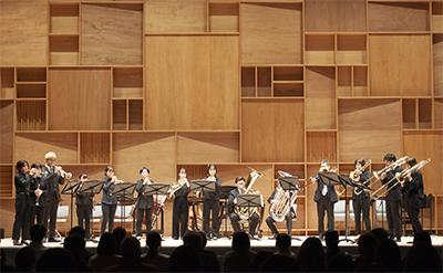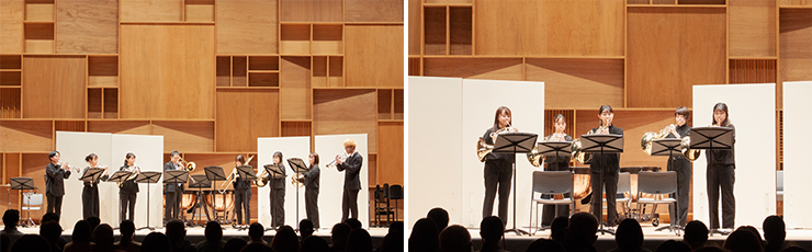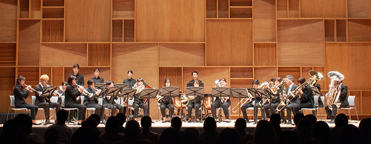 フリートロンボーン奏者の安部彰氏、九州を中心にユーフォニアム・チューバ奏者として活躍する上岡敏宏氏(本学非常勤講師)をゲストに招き、普段コンサートなどで聴く機会の少ないブラスアンサンブルに焦点を当てた8曲を演奏しました。