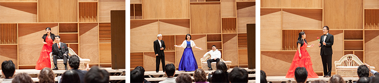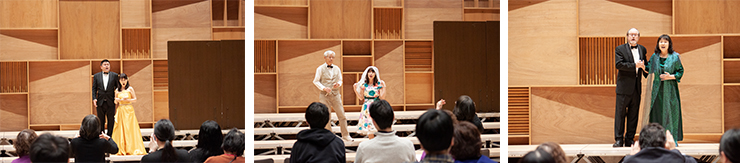 オペラ講座は半年間に、初心者コースと経験者コースに分かれて月2回のレッスンを行っています。発表会は、両コースの混合編成で幅広い世代の受講生が練習の成果を披露しました。指導を担当した音楽科の愛甲久美教授と行天正恭准教授が曲の解説と指揮(兼プロンプター)を行いました。