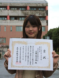 大分県教育委員会が主催する「第9回 おおいた教育の日エッセー募集」で、本学 情報コミュニケーション学科1年 工藤明日香さんの作品が優秀賞を受賞、11月1日に『エイトピアおおの』にて開催された授賞式に出席しました。