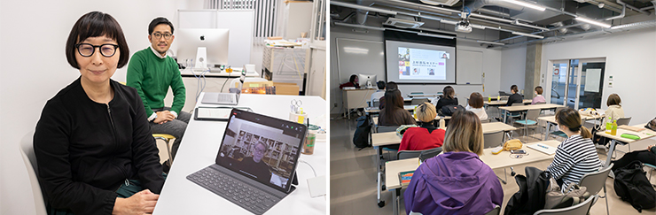 本学非常勤講師の網中いづる氏をファシリテーターとして、上杉さんがイラストレーターとして今まで携わってきた作品に加え、アナログ作品からデジタルへどのように移行したのかその制作過程を紹介。また、コンセプトアートの仕事内容について、作品ができあがるまでのクライアントとの打ち合わせの様子のほか、依頼を受けるに至った経緯などをお話いただきました。