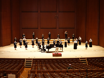 大分県内の中高生42名が参加し、本学非常勤講師 新見 準平指揮のもと「Believe」「Welcome」「花は咲く」など9曲を披露。感染予防のため、生徒はリハーサル前日まで各自で練習を行い、発表では合唱者はマスクの着用、来場者も関係者のみと制限した中で行われました。