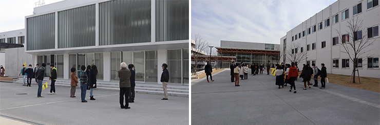 訓練は、2限目終了前、地震発⽣を知らせる⾮常放送を合図に開始。教職員が避難経路の安全を確認するとともに、学生は机の下に潜るなど身の安全を守りながら続報を待ちました。続いて、火災発生の報告もあり、避難開始の放送を合図に、教職員の誘導で全員が安全な場所への避難を行いました。