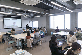プレゼンテーション終了後には、情報コミュニケーション学科野田准教授によるJ-PlatPatを使った商標調査について、また西口准教授より配置と配色などのデザインの基礎についてレクチャーがあり、学生は熱心にメモを取っていました。