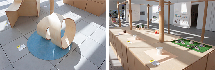 様々な視点からモノの形にアプローチしながら制作したマグカップやイスなど展示しました。学生が互いの作品を講評することで研鑽しあい、デザイン実務に近い形で仕上げています。