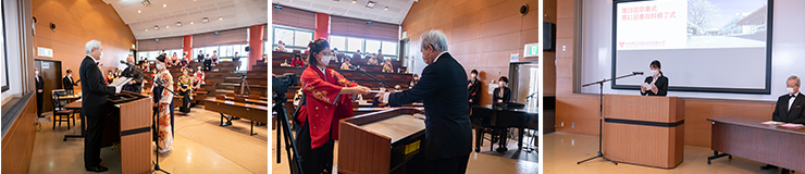 新型コロナウイルス感染症対策のため、学内中継システムを使い各科に分かれて実施。音楽ホールからの音楽科学生によるオーケストラ演奏が中継され、メイン会場の人文棟大講義室で小手川大助学長が、「これまで得てきた知識、経験を糧に、何事にも自信を持って挑戦し、更に磨きをかけていただきたい」と式辞を述べました。