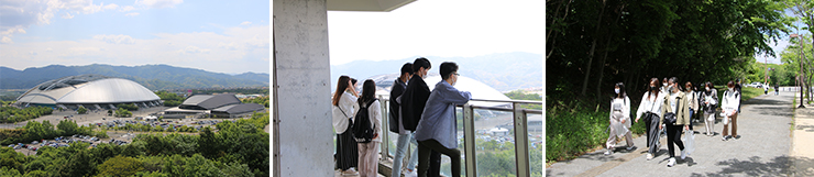 その後、昭和電工ドーム周辺を清掃。担当教員から、大分スポーツ公園が建設されるようになった経緯や建設後の歴史、ドームや公園の建築方法、建設予算、現在の公園管理の課題などについて説明を受け、展望台から大分市内における大分スポーツ公園の立地を確認しました。