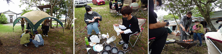 当日は杵築市住吉浜リゾートパークに集合し、タープ、ハンモックなどの設置演習 ・焚火演習・エコクラフト演習などを体験研修しました。学生たちは、ABC野外教育センタースタッフの丁寧な指導により、野外活動の技術だけでなく、子ども達の安全確保、大学生同士の協力体制、コミュニケーションなど多くのことを学びました。