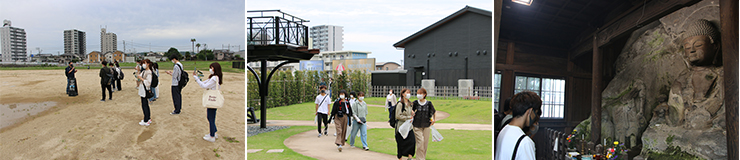 学生は周辺のごみを拾いながら、大学から南蛮BVNGO交流会館に行き、大友宗麟時代の歴史について学びました。ここではシアターや当時の戦国大名のなかでも最大級の大きさと優雅さを誇ったとされる庭園(2020年に再現)を見学し、スマートフォンを使ったVRツアーで当時の館の姿を学びました。また担当教員の綾部准教授から、当時の府内まちの特徴や南蛮貿易が日本にもたらした影響などについて説明がありました。