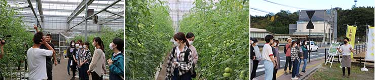 次に、荻町で先駆的なトマト栽培に取り組む「農事組合法人エコファーム21」を訪問し、代表の太田修道氏から、農業栽培の技術や農業に携わることの意義などについて説明を受けました。この法人ではこだわった技術によっておいしいトマトを追求し、地元の雇用創出にも貢献しています。学生は実際にトマトを収穫し、法人関係者と様々な質疑を交わしました。