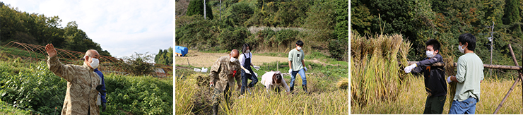 秋空のもと、現地の方に稲の刈り方、結束の仕方、稲の干し方を指導していただき、作業に取り組みました。