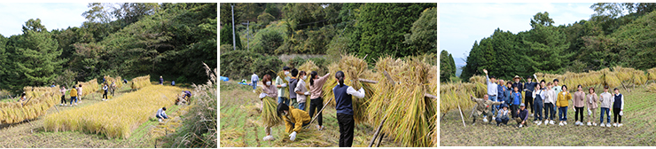 10月30日(土)、人口減少高齢化が進む大分市野津原田ノ口地区において、学生10名が棚田の稲刈り・干し掛け作業の支援を行いました。