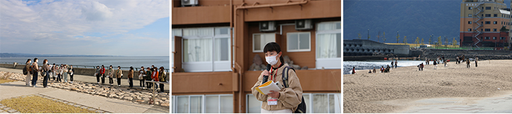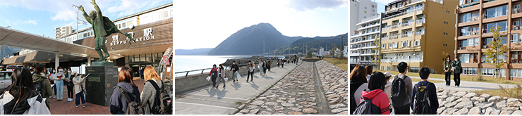 当日は別府市内各所を清掃しながら学生達が、歴史と観光の変遷、伝統工芸(竹細工)のほか、海岸地域の開発、海洋汚染の現状と課題などをグループごとに発表し、別府市の明治、昭和にかけての写真と現在を照らし合わせるなど、まちの変化について体系的に理解を深めました。