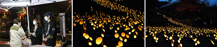 今回の竹楽では、西ノ宮神社での配置デザインと、広瀬神社での竹灯籠の設置・点火作業などを中心に、会場本部の受付や誘導、竹田市の情報発信活動にも取り組みました。同時に会場で赤い羽根の共同募金応援プロジェクトの活動も行い、市民の方々に、募金のご協力をいただきました。