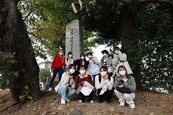 芸文短大正門にある大分高等商業学校記念碑群から、大臣塚古墳、元町石仏、高良神社など大学周辺に点在する史跡のうち12カ所を巡り、ゼミ受講者10名が各地の歴史や名前の云われ等、事前に図書館や現地へ赴いて調査した成果をそれぞれ発表しました。