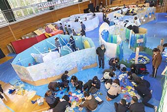 会場では、「スイスイ!!海の底をスタンプラリー」をテーマに、学生が5つのグループに分かれ、大きなダンボールや和紙、ビニール紐など様々な材料で、巨大迷路の土台や飾りつけのための道具を準備し、児童を迎えました。