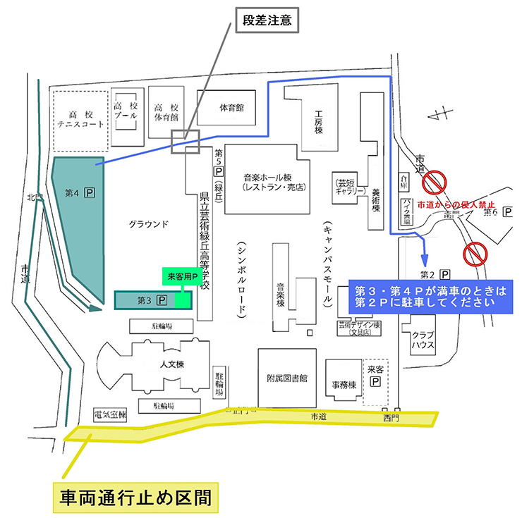 つきましては、通行止めの期間中は第3・第4Pに駐車してくださ い。
